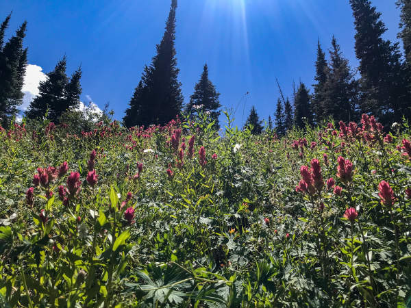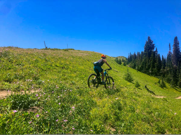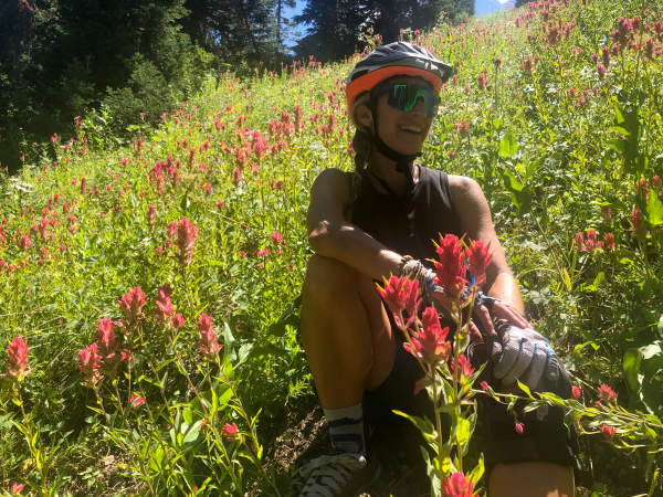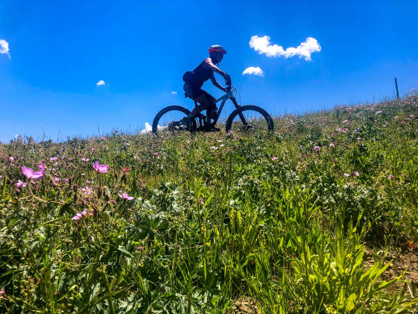 Betsy thought this would be a great trail to show me as it was new, fun, flowy, and the wildflowers were popping! I was excited to explore a new spot and ride amongst the peaking wildflowers. The trail was in excellent condition and had some nice little climbs intermingled with smooth downhills. Betsy was super knowledgeable about the surrounding trails, and she’d give me a heads up on what was ahead and was able to dole out little nuggets of feedback on my riding. She also offered to take some hero shots of me shredding amongst the wildflowers because you know I do it for the ‘gram!