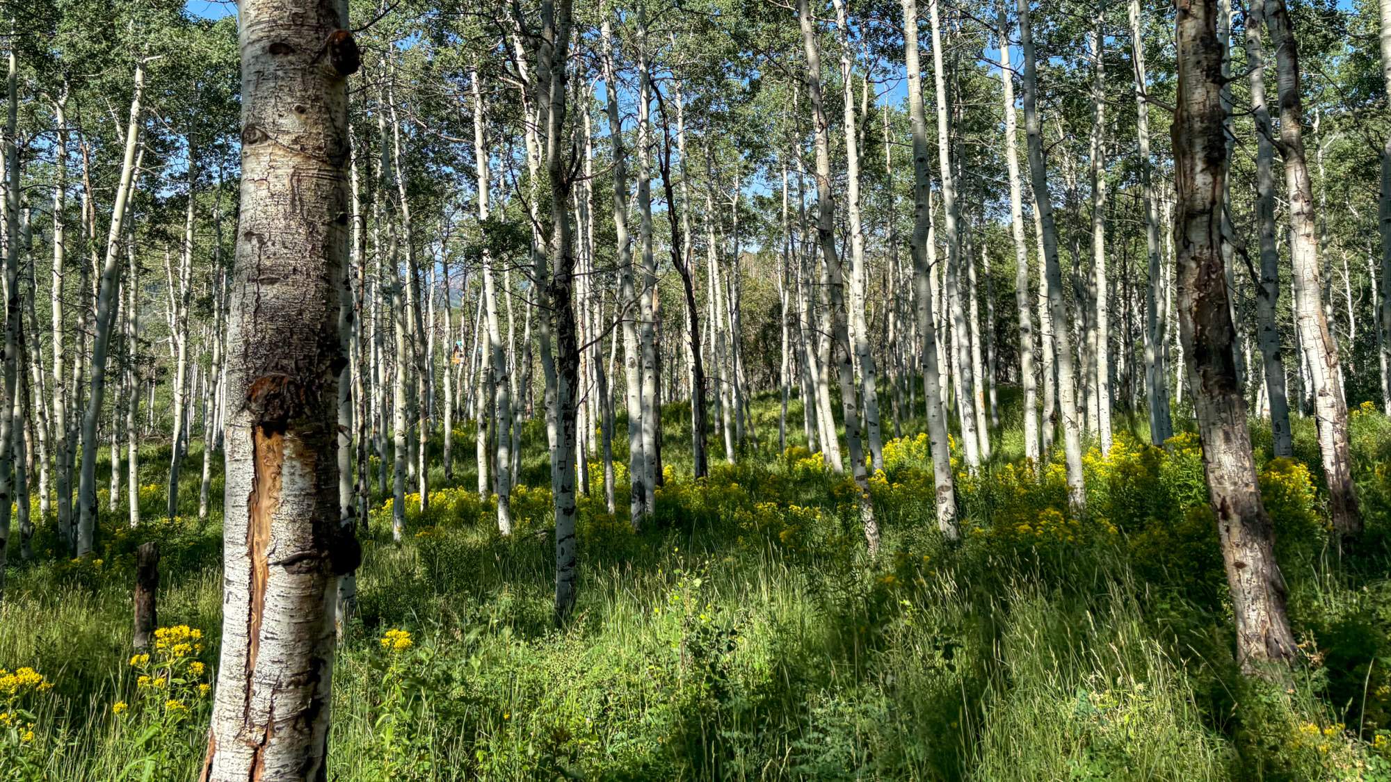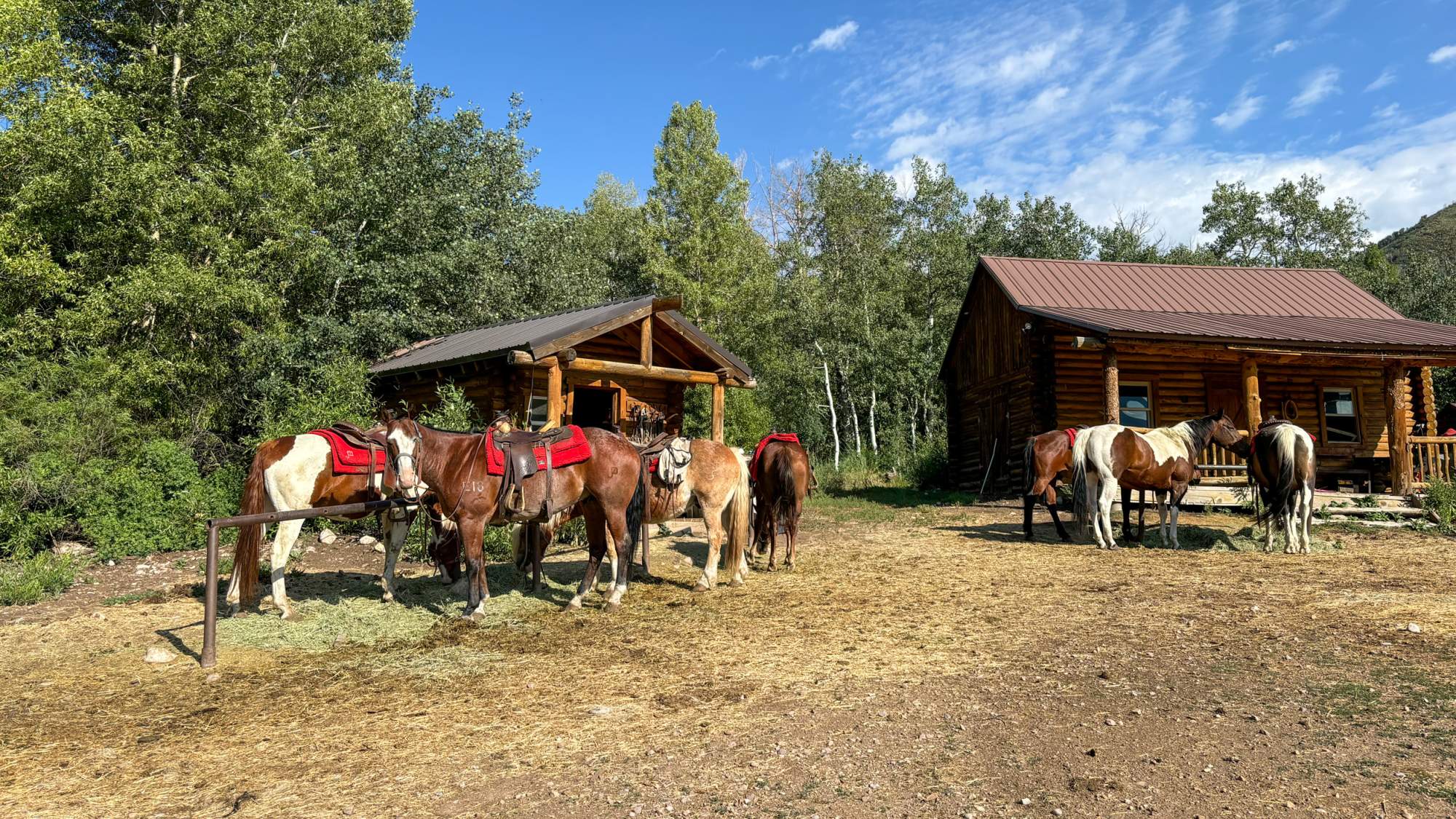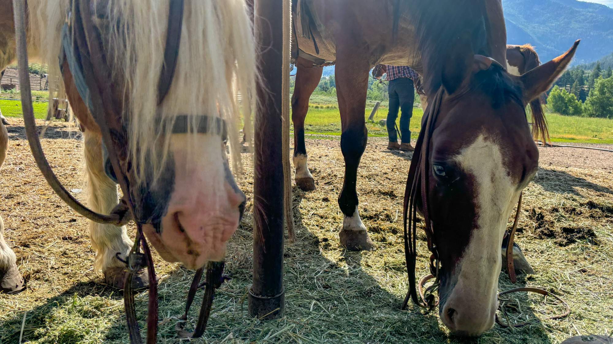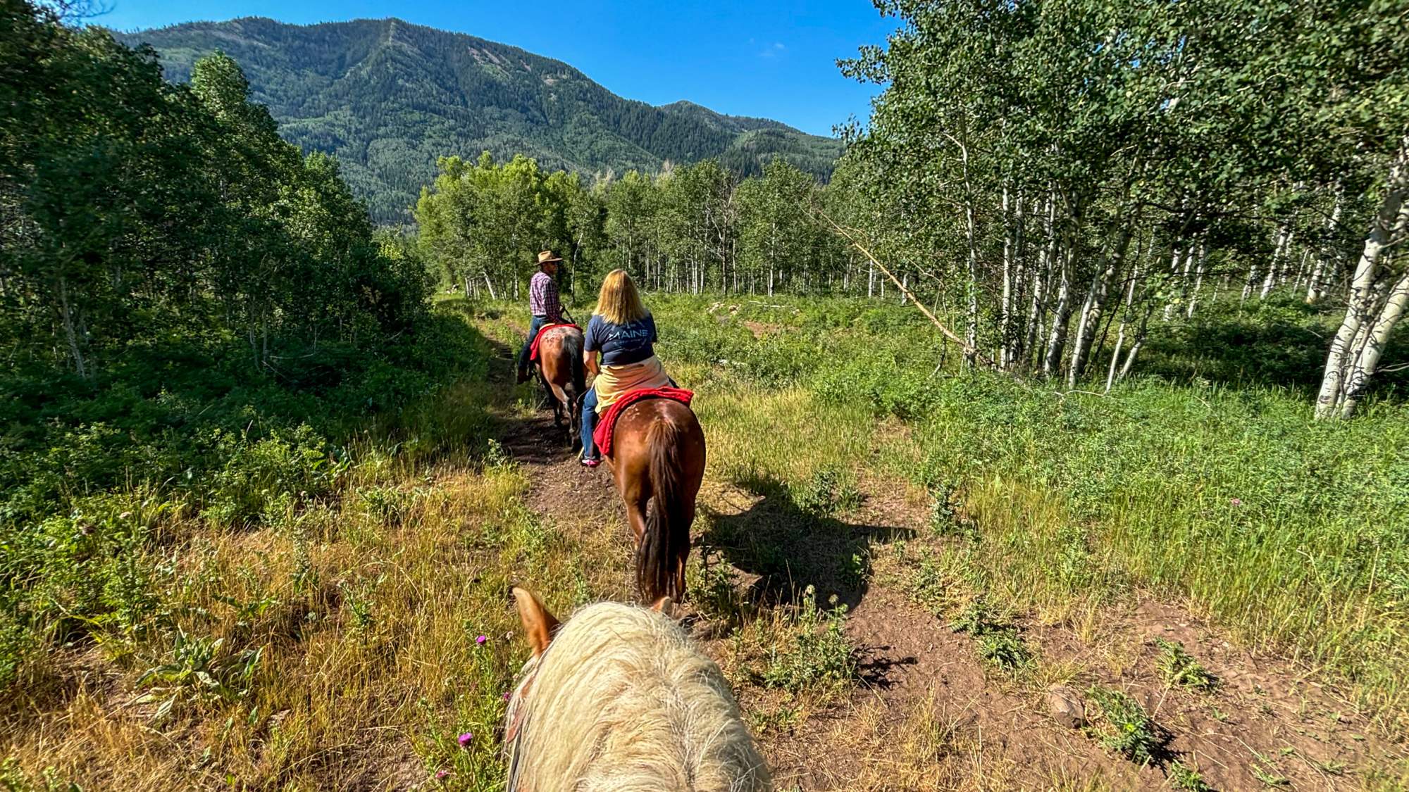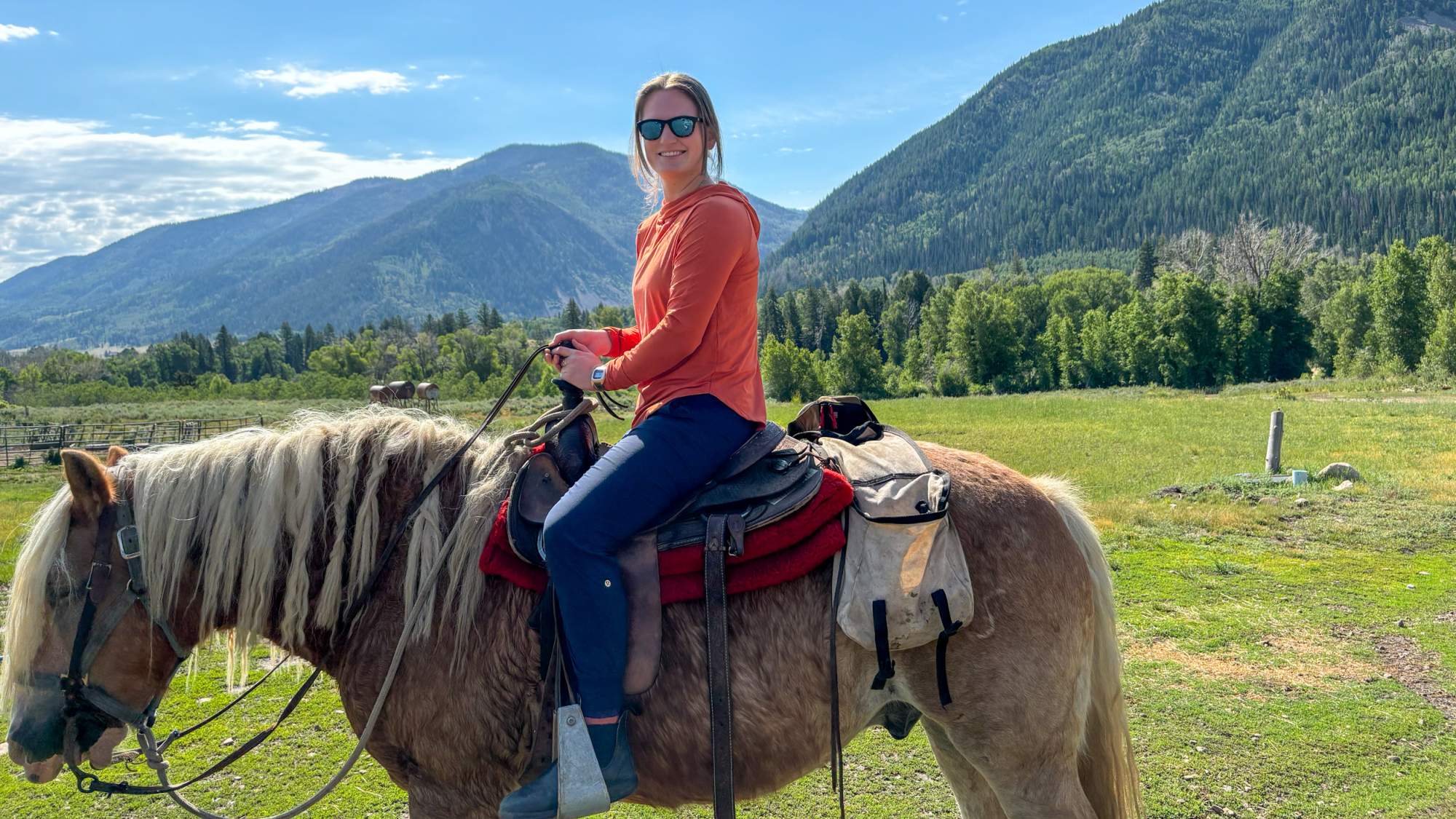 While riding, Shaggy seized every opportunity to snack on any piece of tall grass or purple thistle within reach—a horse after my own heart. Aside from Shaggy’s chewing, there were moments where all I could hear was the rhythmic clopping of hooves and the gentle rustle of the aspen leaves we brushed past. The expansive meadows stretched for what felt like miles before we entered a denser forest by crossing stream after stream. The peace and tranquility were palpable, allowing me to truly unplug and connect with my surroundings.